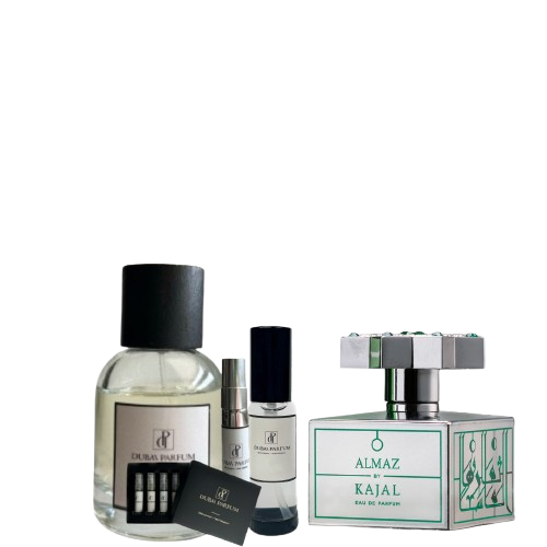 Парфумована вода від бренду Kajal втілює делікатну жіночність, витончену м'якість, що бездоганно поєднується з іскристою життєрадісністю. Витончене мерехтіння, первозданна чистота, спокусливе бажання - саме такими словами можна описати аромат. Аромат Almaz був створений відомим парфумером Ранією Джуане, відомою своїми вишукано потужними та чуттєвими парфумерними творіннями. Омар Аюб, дизайнер та архітектор флакону та упаковки для Almaz, пояснює: «Провідною концепцією дизайну стала фраза: «Красиві та дорогоцінні діаманти народжуються під впливом часу та тиску». Омар створив справді вражаючий дизайн, включивши в нього прекрасний вірш Елен Жерес Аюб, чудово виконаний східною каліграфією куфічного стилю.